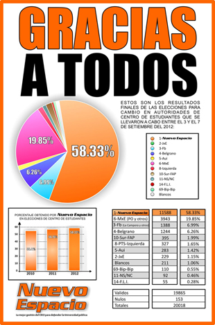 Gracias… Al 58.33% que sigue apostando en la gestión de Nuevo Espacio, que confían y apoyan el trabajo de todo el año, y que nos siguen haciendo la agrupación mas votada en toda la UBA.