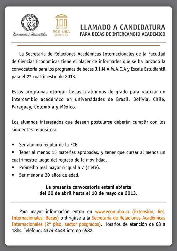 Llamado candidatura a becasLLAMADO A CANDIDATURA PARA BECAS DE INTERCAMBIO ACADÉMICO2° Cuatrimestre de 2013. La convocatoria estará abierta desde el 20 de abril hasta el 10 de mayo. admin10 abril, 2013Becas LLAMADO A CANDIDATURA PARA BECAS DE INTERCAMBIO ACADÉMICO