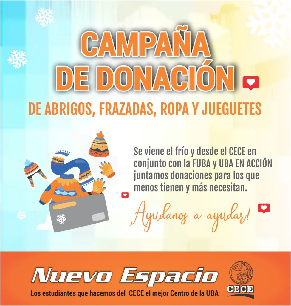 Campaña de donación: ropa de abrigo y frazadasSe viene el frío y desde el CECE queremos ayudar a los menos tienen y más lo necesitan. admin18 julio, 2022Campañas Solidarias Se viene el frío y desde el CECE queremos ayudar a los menos tienen y más lo necesitan. Si tenés ropa para donar, podes acercarlo a la mesa de Nuevo Espacio o al Local de CECE (Av. Córdoba 2122) de lunes a viernes de 7:00 a 21:00hs AYUDANOS A AYUDAR! SUMATE #OrgulloUBA