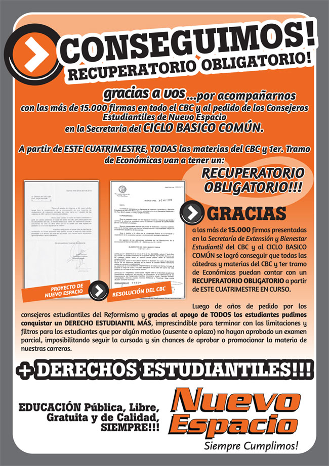 con las más de 15.000 firmas en todo el CBC y al pedido de los Consejeros Estudiantiles de Nuevo Espacio